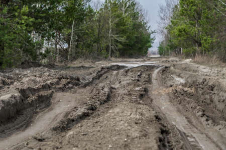 Spring landscape. Dirty spring road. Impassability and mudslides.