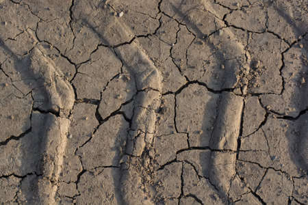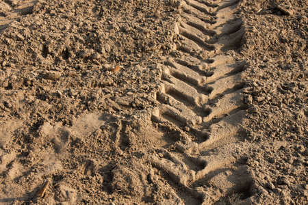 Track pattern trail from vehicle on dirty sandy road soil from wheel texture background.