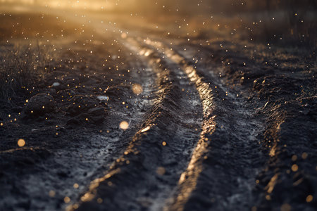 A deep tread mark from heavy machinery is carved into wet soil, illuminated by the warm, low light of sunrise or sunset. The track creates a powerful leading line, suggesting a story of progress, construction, or a long days work. The textured mud and golden highlights evoke a sense of rugged industrial or agricultural activity.