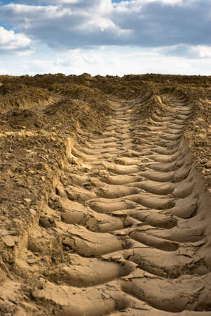 Tire track on sand at construction site. Tire tracks printed in the sand.