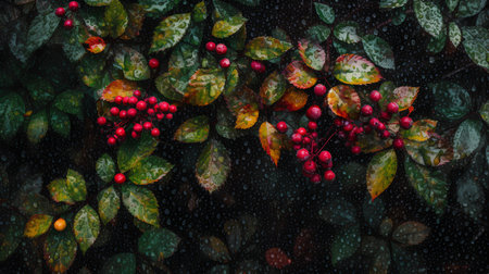 Vibrant Red Berries. Close up view of Cotoneaster horizontalis shrub, showcasing its dense foliage covered in vibrant red berries creating captivating natural texture during autumn season.