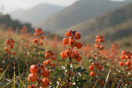 Detailed focus on the forest's wild berries reveals their natural texture, vibrant red hues contrasting with lush green foliage