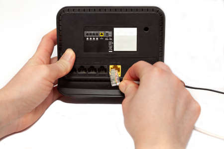 tearing with force the internet cable from the adsl modem by a person in the background