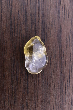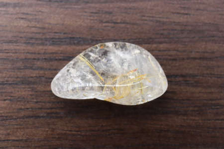 Rutilated Quartz mineral stone close up on wooden background. Golden Rutile inclusions in quartz gemstone