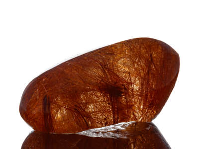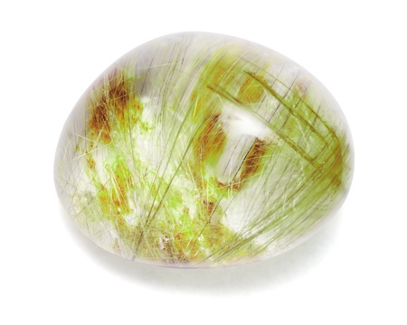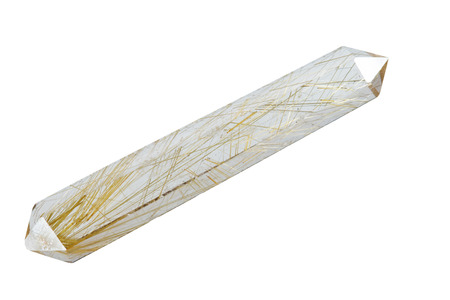 Macro mineral quartz hairy stone, quartz with rutile on a white background close up
