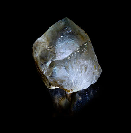 crystal of topaz of tea color on black glass with reflection