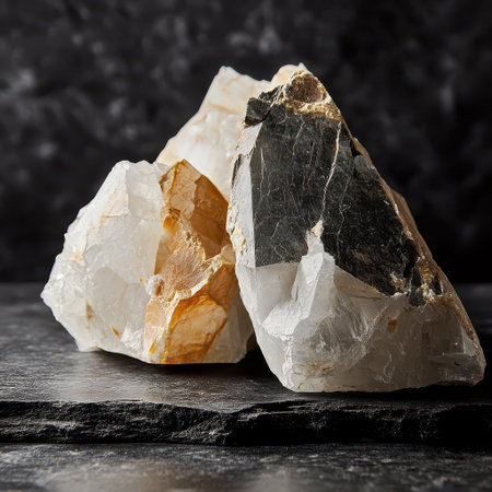 Close up shot of cut white quartz stone on dark surface.