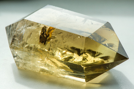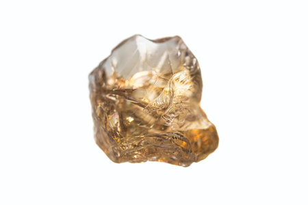 Macro shot of citrine stone on white background. Yellow, clear crystal with a dark, smokey color, smoky quartz with ornaments and rainbows in it. Powerful source of energy and healing