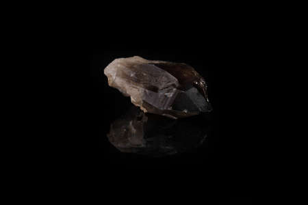 Close-up of smoky quartz stone from Ural region, Russia on black glass background. Rauchtopaz crystal on black glass background.