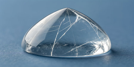 Clear transparent crystal or glass dome shaped object with internal cracks. Smooth polished surface with intricate fracture lines. Refractive material on a solid blue background. Unique gemstone like structure with abstract patterns. Light plays within substance.