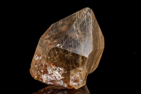 Macro stone mineral Rutile in quartz on a black background close up