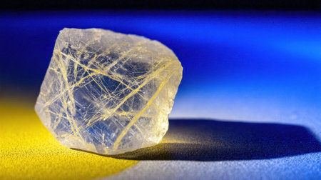 A translucent quartz crystal is the primary subject, exhibiting internal structures and textures. The image uses a gradient backdrop of yellow and blue hues, creating a contrast. This composition features soft lighting and a shadow, suggesting a studio setting, suitable for illustrating mineralogy, geology, or conceptual uses.
