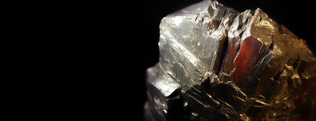 Raspite is a rare precious natural geological stone eremite on a black background in low key. Fashionable jewelry elegant decoration. AI generated. Header banner mockup with space.