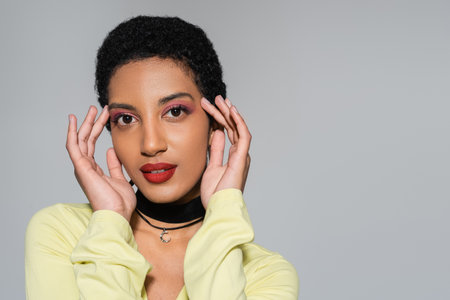 Portrait of pretty african american woman touching face isolated on grey