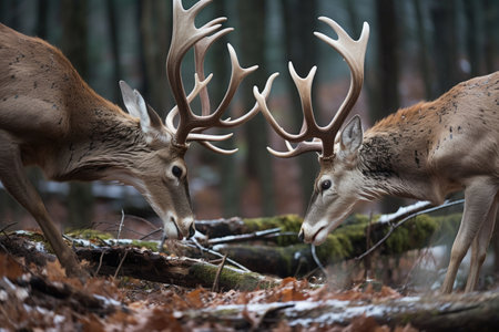 two deer locking antlers in aggression, created with generative ai