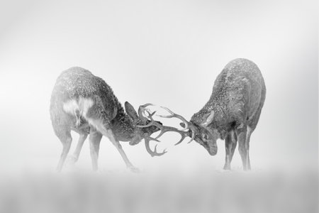 Two deers fight on the fog on a light background, black and white photo