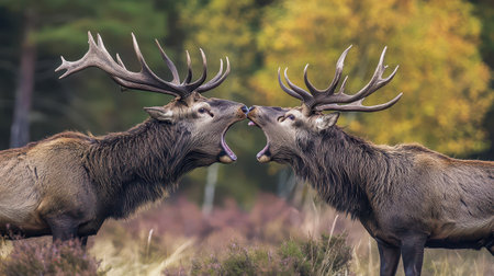 Two majestic stags face each other in a vibrant forest their antlers raised high as they vocalize intensely during the rutting season.
