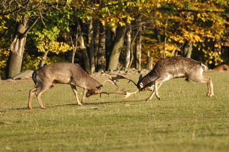 Fighting fallow deers in rut with autumn wood in background