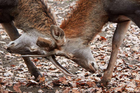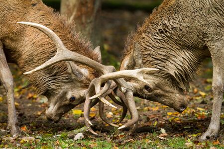 Two young red deer stags locking antlers in a fight during the rutting season in autumn, UK.