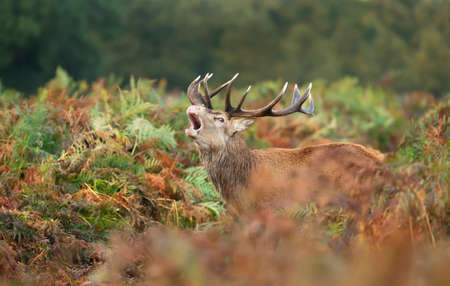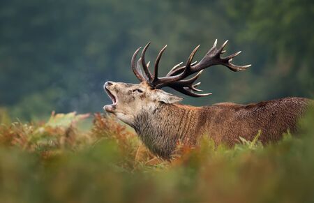 Close-up of a red deer stag calling in a field of ferns during rutting season in autumn, UK.
