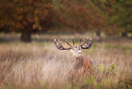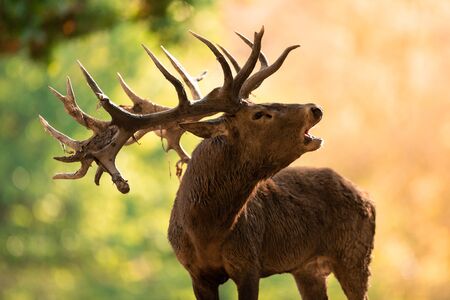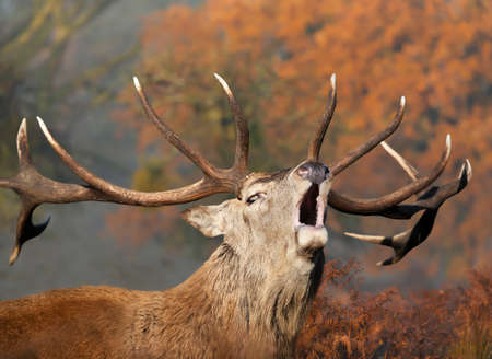Portrait of a majestic red deer stag with large antlers calling during the rut in autumn, UK.