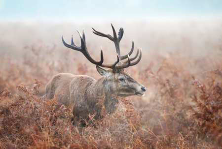 Close-up of a red deer stag standing in the field of ferns during rutting season on a misty autumn morning, UK.