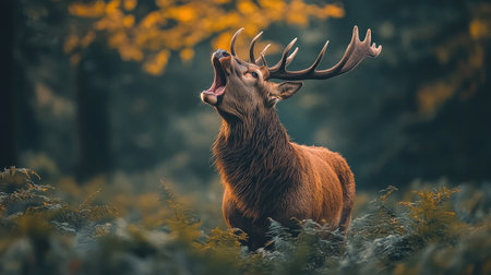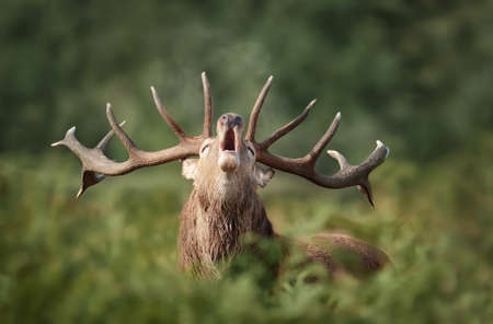 Red deer stag bellowing in a forest with its mouth wide open, surrounded by ferns