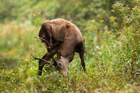 Red deer scratching neck in forest in autumn nature