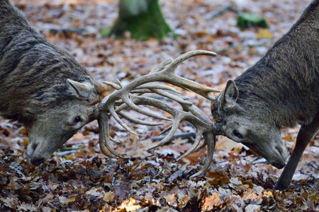 two buck deer stags fighting in autumn forest