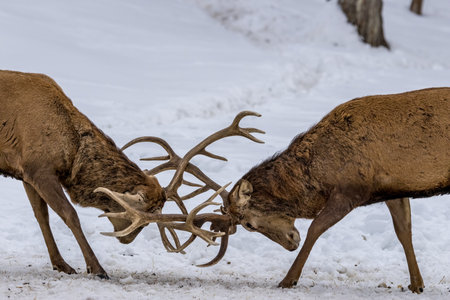 Two deers fighting in a forest in Ontario, Canada at a cold but sunny day in winter.
