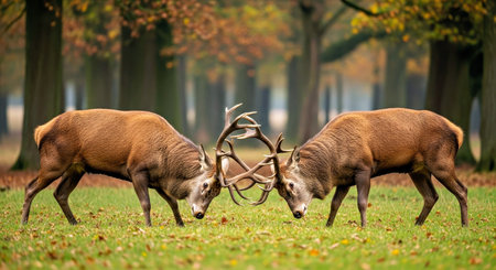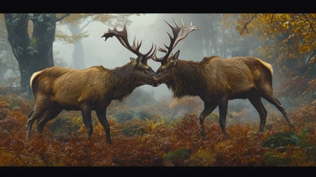 A pair of red deer stags fighting, with their antlers clashing in a misty autumn forest.