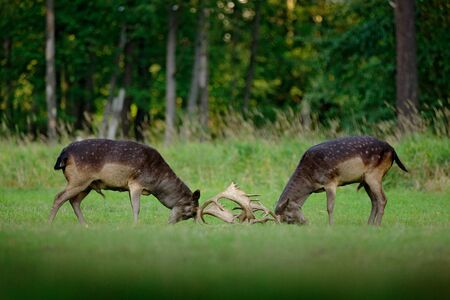 Two Fallow deer, Dama Dama, male fight during rutting season. The Autumn sunlight and nature colors are clearly visible on the background.