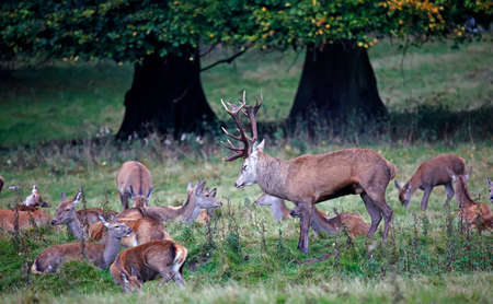 Red deer stag with hinds in autumn forest. North Rhine-Westphalia, Germany