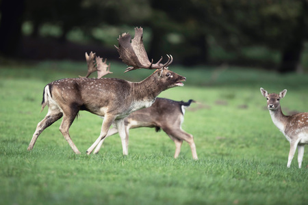 Bellowing fallow deer buck in meadow between females.