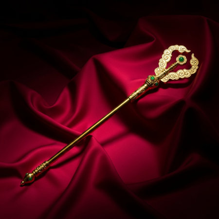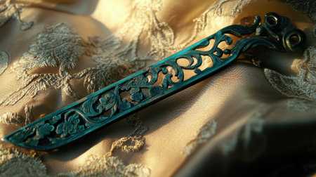 Detailed close-up of an ornate decorative bookmark featuring intricate floral patterns resting on rich, textured fabric, reflecting elegance and craftsmanship.