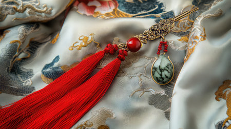 This close-up image features an elegant Chinese hairpin adorned with red tassels, beautifully resting on vintage silk fabric with intricate floral patterns.