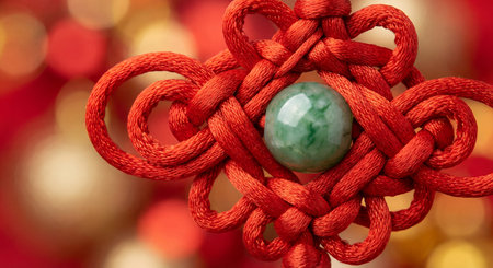 Close-up of a red Chinese knot ornament featuring a jade stone centerpiece, set against a blurred background of festive decorations, symbolizing good luck and prosperity during Chinese New Year