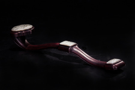 A close up shot of a chinese jade massage tool.