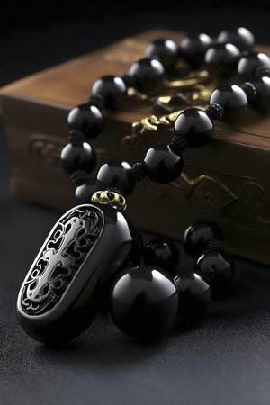 Close-up of a black obsidian necklace with an intricately carved cross pendant.