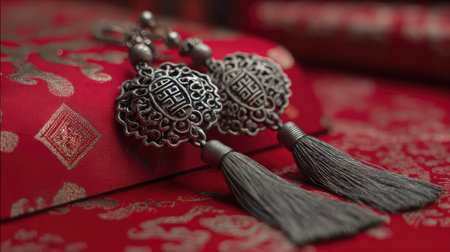 This image showcases elegant silver earrings adorned with tassels, resting on rich red fabric, embodying traditional craftsmanship and cultural beauty. Perfect for fashion and accessory themes.