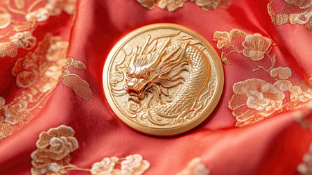 A stunning golden dragon emblem rests on a vibrant red silk fabric, showcasing intricate floral patterns. This artwork embodies tradition and elegance.