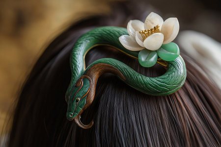 Woman is wearing a green wooden snake hairpin with a flower, adding a touch of elegance and cultural significance to her hairstyle