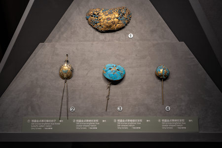Ancient Chinese ornate hairpins with gold and turquoise in museum display