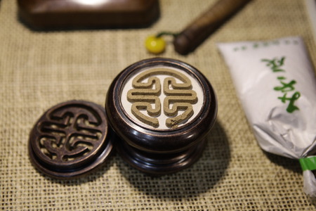 Traditional Chinese calligraphy on a wooden table, closeup of photo