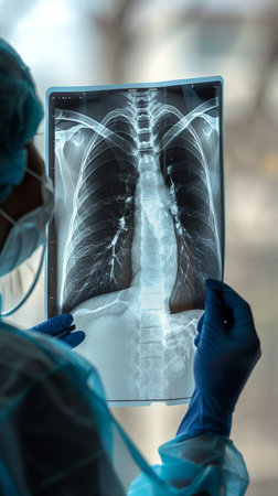 Healthcare worker analyzing X-ray of lungs, medical charts and screens in background