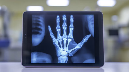 Detailed view of hand x-ray displayed on tablet in medical setting