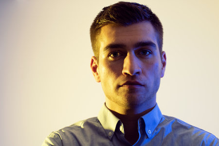 Portrait of young bearded man in white shirt against dark blue background
