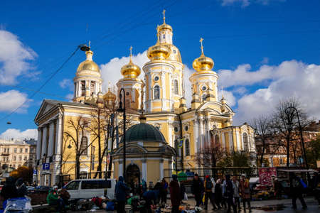 Saint Petersburg, Russia, 17 October 2021: Cathedral of Vladimir icon of mother of God in Central district, Our Lady of Vladimir or Vladimirskaya church with golden domes and bell tower on sunny day