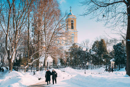 Gomel, Belarus - January 27, 2019: Two Women Walking In Winter City Park. Famous Local Landmark Is Peter And Paul Cathedral On Background
