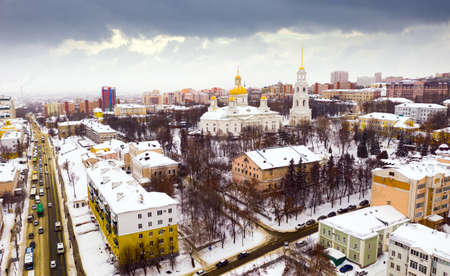 Aerial view of snow covered Kolomna cityscape with Kremlin